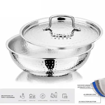 The NIRLON Tri-Ply Hammered Tasra TS24 is a 24 cm (240 mm) diameter cooking vessel designed for everyday culinary needs. Part of NIRLON's Hammered Series, this tasra combines traditional aesthetics with modern cooking technology.