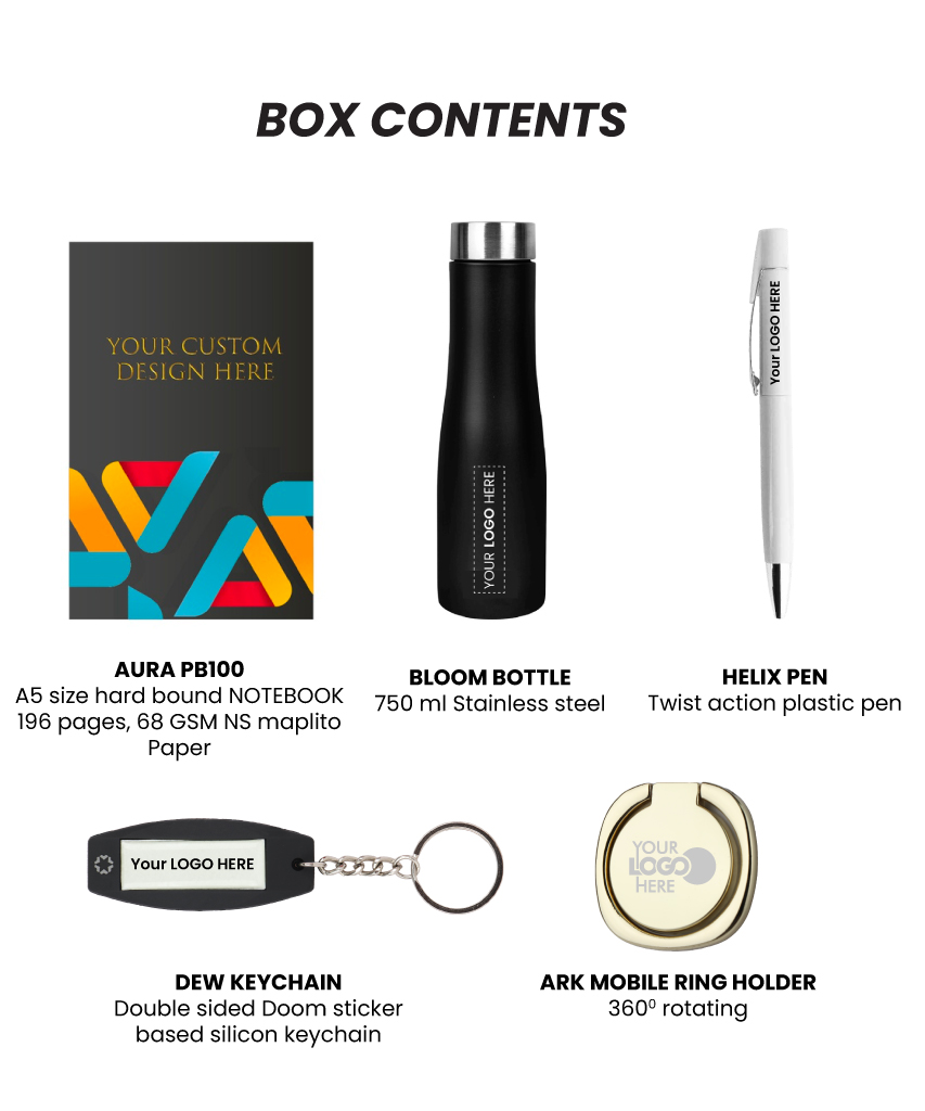 Box Contents Aura PB100, Bloom Bottle, Helix Pen, Dew Keychain, ARK Moblie Ring, Holder