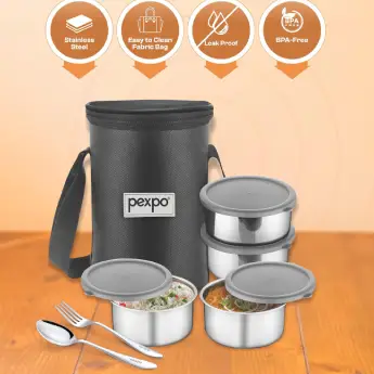The PEXPO Eco Pro 4 is a thoughtfully designed stainless steel lunch box set, ideal for individuals seeking a reliable and portable solution for carrying meals. Whether you're heading to the office, college, or embarking on a road trip, this set ensures your food remains fresh and secure during transit.