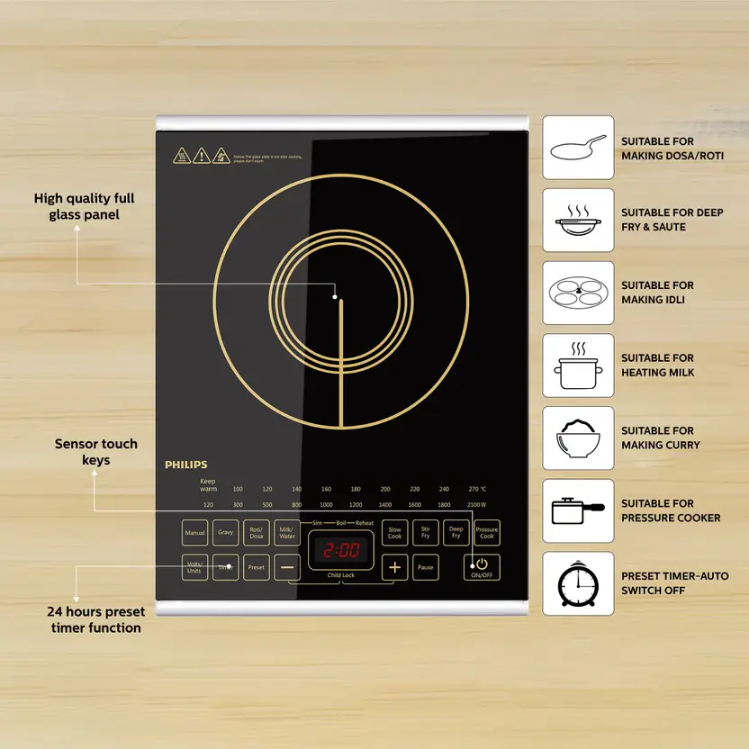 The Philips HD4938/00 Induction Cooktop is a sleek, high-performance kitchen appliance designed to make cooking faster, safer, and more energy-efficient. With a powerful 2100W heating capacity, this cooktop ensures quick and consistent heat distribution, allowing for precise temperature control and efficient cooking. Its advanced induction technology only heats the pan, minimizing heat loss and reducing energy consumption.