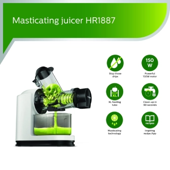 The Philips HR1887/81 is a premium masticating slow juicer designed to extract the maximum nutritional value from fruits, vegetables, and leafy greens. With its innovative features and sleek design, it's an ideal choice for health-conscious individuals seeking fresh, homemade juices daily.