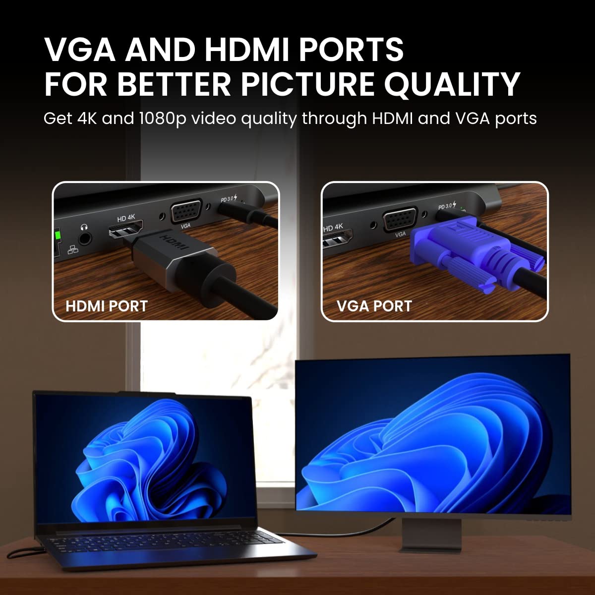 * Mport 13C USB hub comes with 13 ports to give you the maximum device support possible to make working easy for you. With 4 USB 3.0 ports, 2 Type-C data ports, VGA port, 1 Type-C 3.0 PD charging port, RJ45 Ethernet port, HDMI 4K port, SD card slot, TF card slot, 3.5mm jack, make working and multitasking easy for yourself.