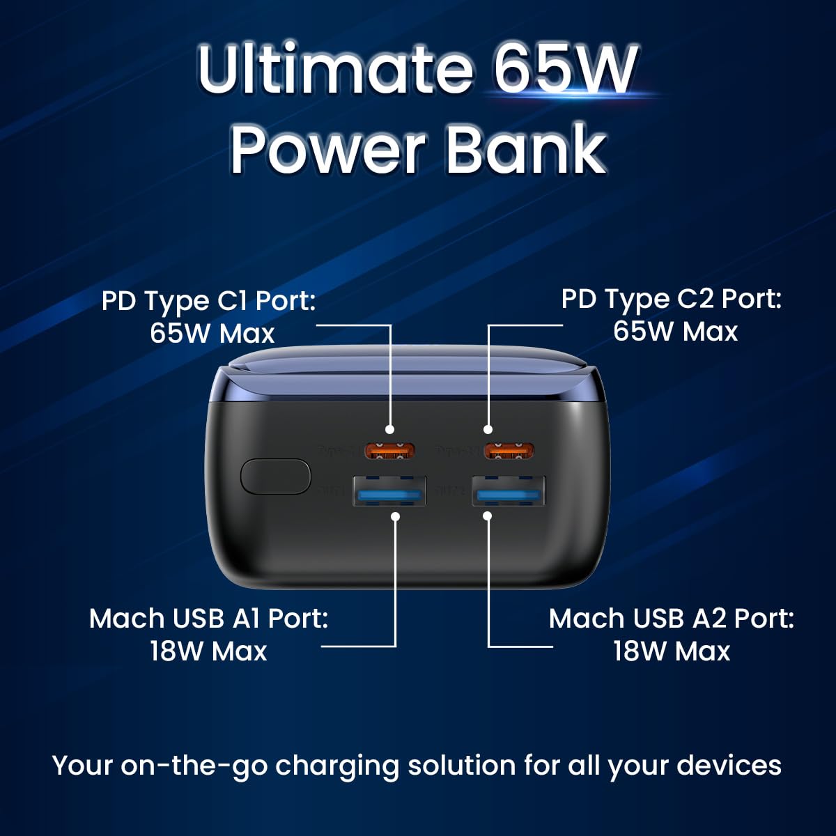 * Laptop Charging Charge your laptop on the go with our power bank's 65w Type C PD port. Enjoy uninterrupted work or entertainment with the versatility to charge laptops, phones, and tablets from a single portable source.