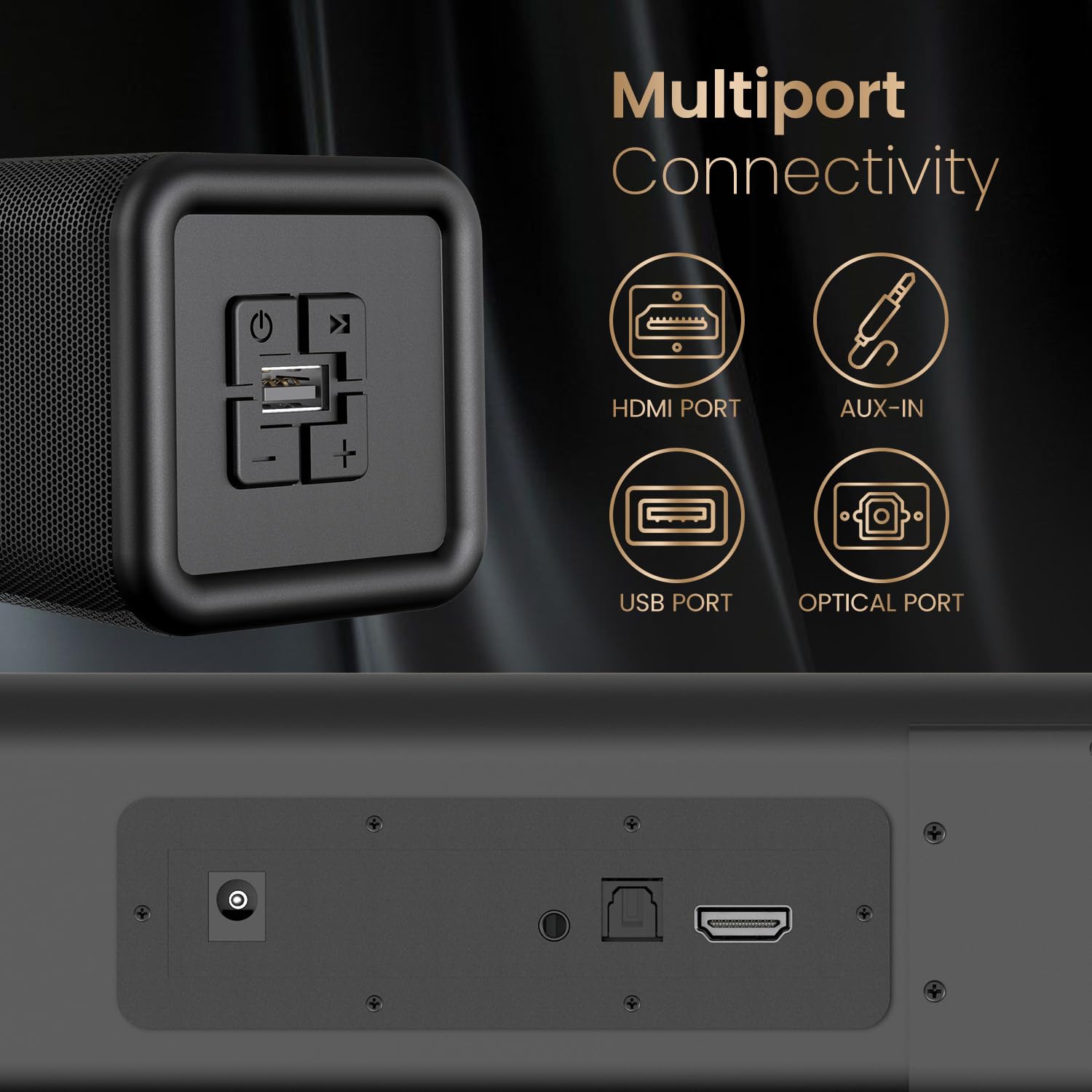 The Portronics Pure Sound 107 200 W is a premium soundbar designed to deliver an immersive, cinematic audio experience right in your living room. With a powerful 200W output, it ensures rich, dynamic sound with deep bass and clear treble, transforming your movie nights, music sessions, and gaming into a high-quality audio experience.Featuring Bluetooth 5.0, the soundbar provides seamless wireless connectivity with your devices, such as smartphones, tablets, or laptops, allowing you to stream music and audio without interruptions. Additionally, it includes multiple input options, including HDMI, AUX, and USB ports, making it compatible with various devices and audio sources for a versatile setup.The Portronics Pure Sound 107 comes with a sleek, modern design that complements any home entertainment setup, while its easy-to-use remote control offers convenient access to all features, including volume control, sound modes, and inputs. Whether you're watching movies, listening to music, or playing games, this soundbar enhances every sound detail with powerful clarity.For a truly immersive sound experience, the Portronics Pure Sound 107 is also designed to optimize bass and vocals, giving you a rich and balanced sound profile that can fill even larger rooms. Additionally, it’s built with advanced audio technology to ensure distortion-free performance, even at higher volumes.Perfect for any home theater or audio setup, the Portronics Pure Sound 107 200W soundbar is the ultimate choice for users seeking a robust, high-performance sound system that combines sleek design, powerful sound, and versatile connectivity.