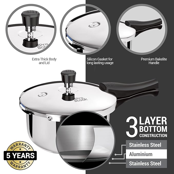 Introducing Milton Pro Cook Pressure Cooker Inner Lid. Prepare delicious meals in less time with our stainless-steel pressure cooker. This cooker made up of three different layers of metal bonded together top & bottom stainless steel with an encapsulated layer of aluminium in the middle right throughout the cookware for even heat distribution. It's special extra thick induction base makes it compatible with both gas stove and induction cooktops, adding to its versatility. It has Metallic safety plug which act as a safety, to release excess pressure if generated any. Safety valve on lid to release pressure and maintain cooking temperature inside the cooker. Ergonomically designed handles for better gripping and locking. The handles are designed to provide optimal comfort and protection from excessive heat when the cooker is in use. It has Food grade Nitrile Gasket for sealing of lid & body. Use this pressure cooker to cook lip - smacking sabzis, dal, rice, meat and much more. This Product Is Under 5 Year Warranty From The Date Of Retail Purchase Against Any Manufacturing Defects In Material And Workmanship. The Warranty Does Not Cover Damages Resulting From Accidents, Mishandling Or Tampering With The Mechanism. Warranty Valid Against Producing Original Bill Endorsed By Seller. For any queries kindly reach customer care number as mentioned on the product packaging along with the proof of purchase.