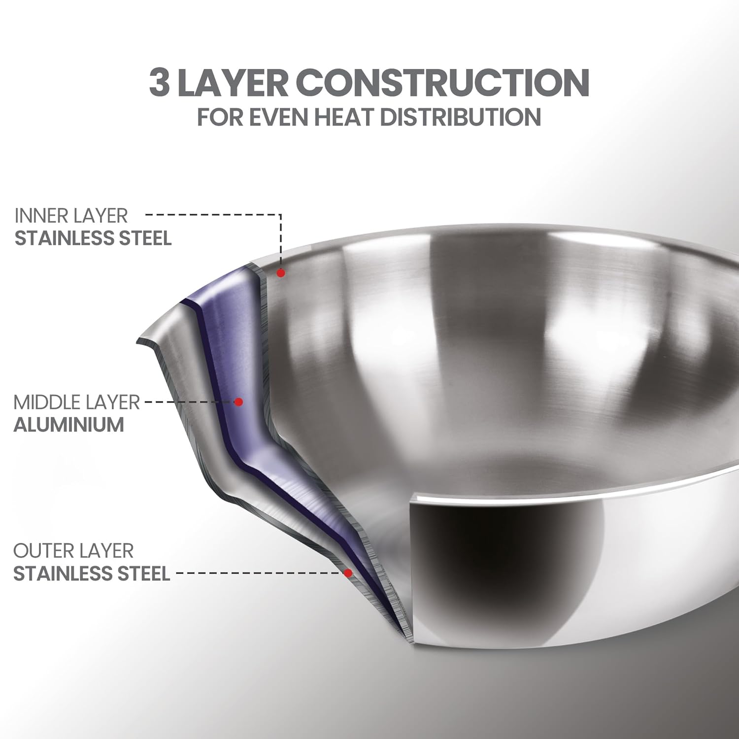 * Tri-Ply Excellence The tri-ply construction features three layers, food-grade 18/8 stainless steel for safe cooking, a middle layer of encapsulated aluminum for even heat distribution and faster cooking, and SS 430 magnetic stainless steel on the outside for induction compatibility, ensuring uniform cooking, no hot spots, and consistently delicious results.