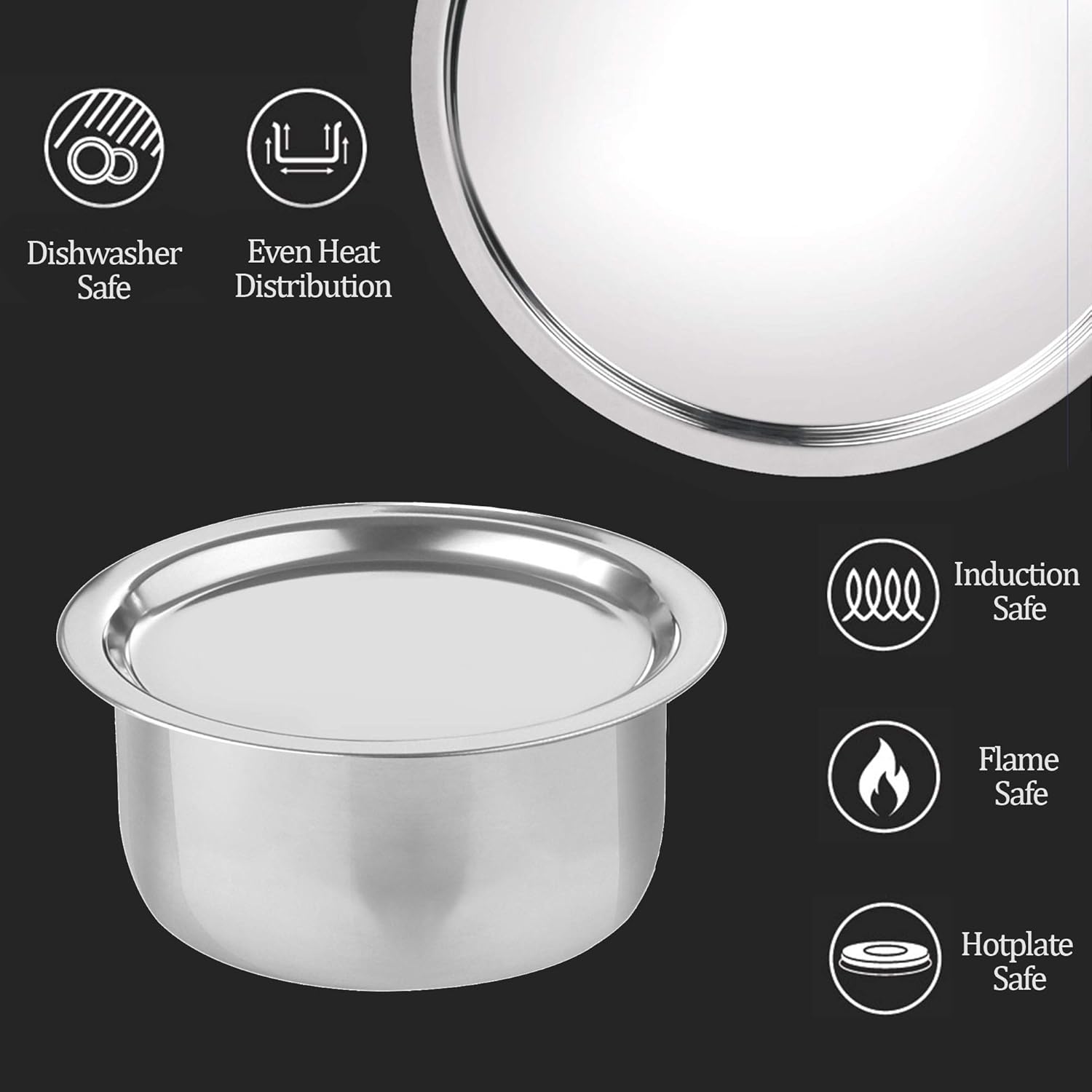 * Tri-Ply Excellence The tri-ply construction features three layers, food-grade 18/8 stainless steel for safe cooking, a middle layer of encapsulated aluminum for even heat distribution and faster cooking, and SS 430 magnetic stainless steel on the outside for induction compatibility.
