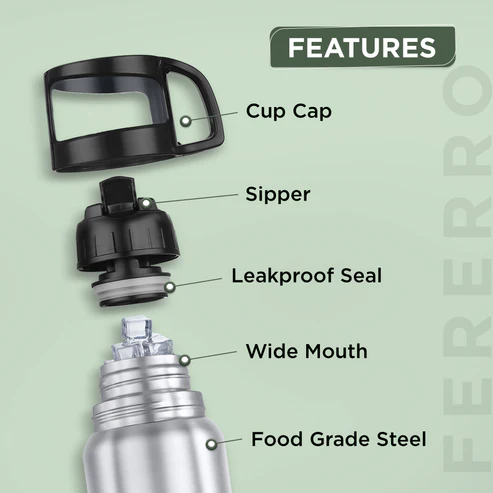 * Sipper Cap with Steel Cap: Features a sipper-style lid for easy pouring and a sturdy stainless steel cap for a secure seal and premium finish.
