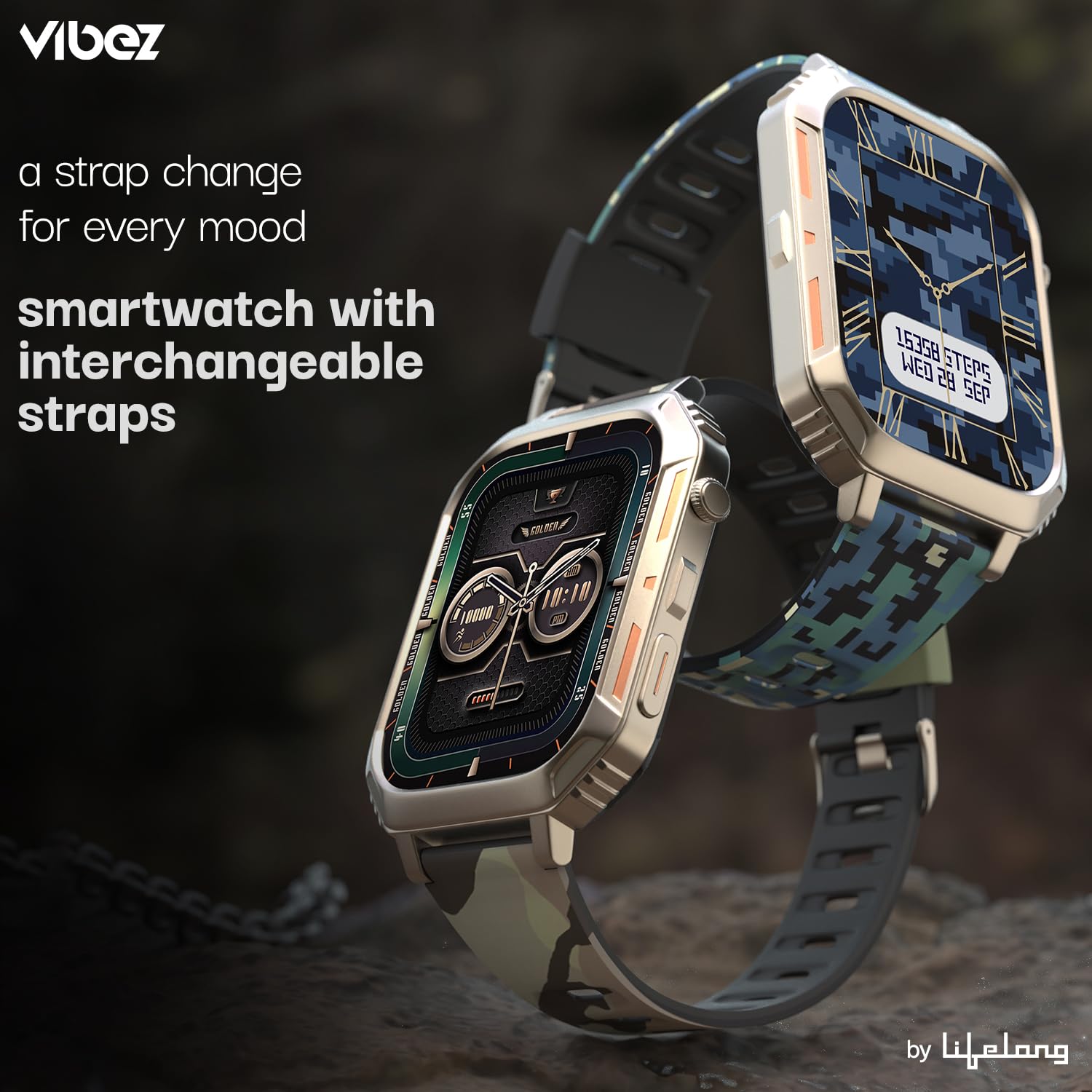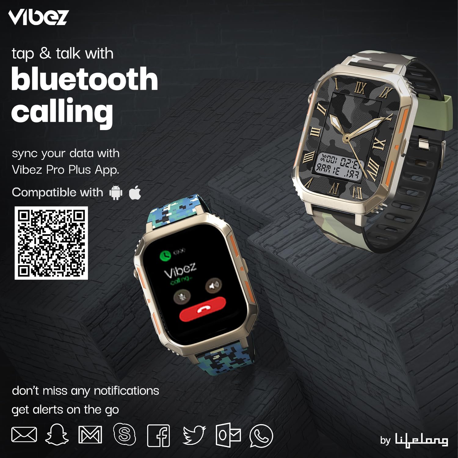 * Rough Design: With its rectangular dial and straps with a military pattern, this adds a touch of rough and ruggedness to your wrist, complementing your style.;Bluetooth Calling: With Vibez by Lifelong Trooper, stay connected on the go with Bluetooth and easily answer or reject calls directly from your smartwatch, ensuring you never miss an important call while keeping your phone in your bag or pocket.
