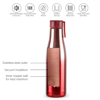 * Vacusteel Technology comes with double stainless wall with Copper coating on the inside to minimize loss of temperature and keep beverages hot or cold for a prolonged period of time.