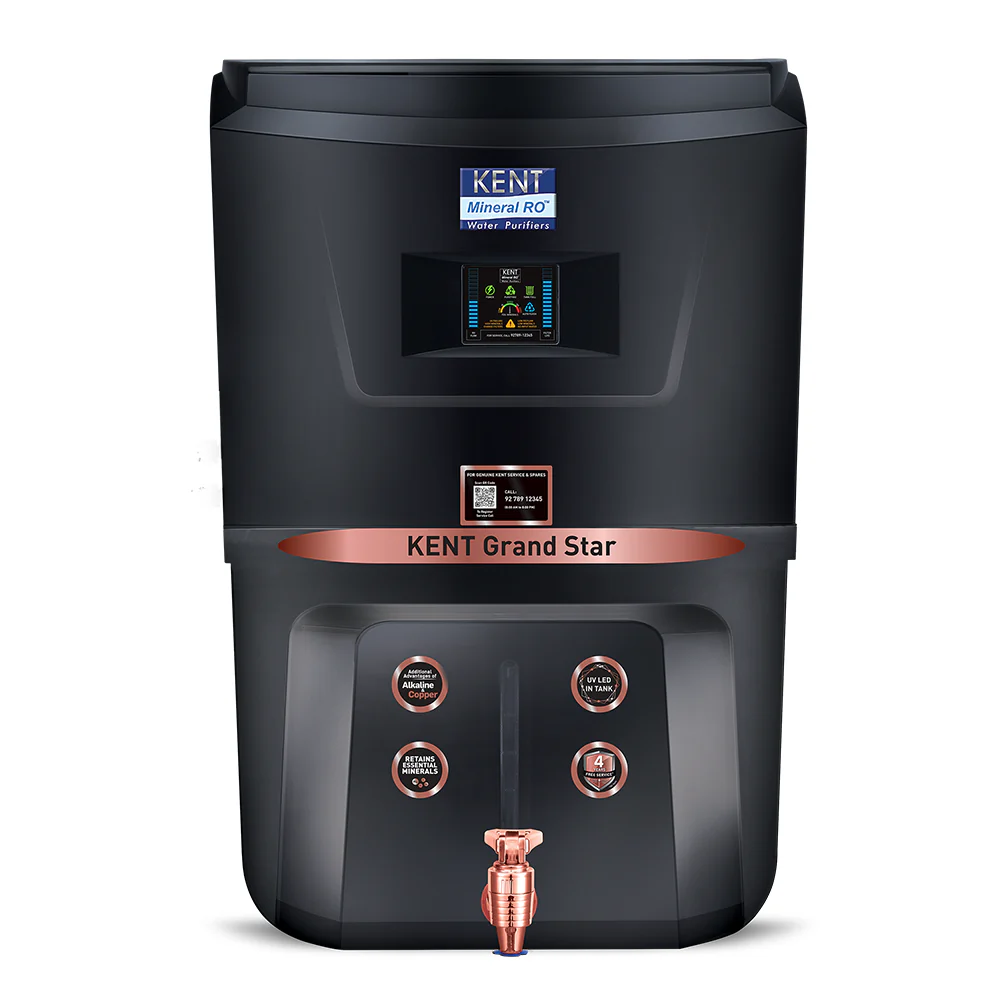 Now drink pure and mineral-rich purified water with KENT Grand Star, an advanced RO water purifier with multiple purification process of RO+UV+UF+TDS Control+Alkaline+Copper+UV In-tank, and Zero Water Wastage Technology. It enhances water with an alkaline pH of 8.0+ while delivering the natural benefits of Copper. This purifier comes with a unique Digital Display of Purity feature that allows real time monitoring of purified water quality, filters life, RO flow rate etc. Also, the Mineral ROTM technology helps retaining essential natural minerals in the purified water. Best suited for Indian homes and offices, KENT Grand Star is ideal for purifying brackish, tap and municipal corporation water.